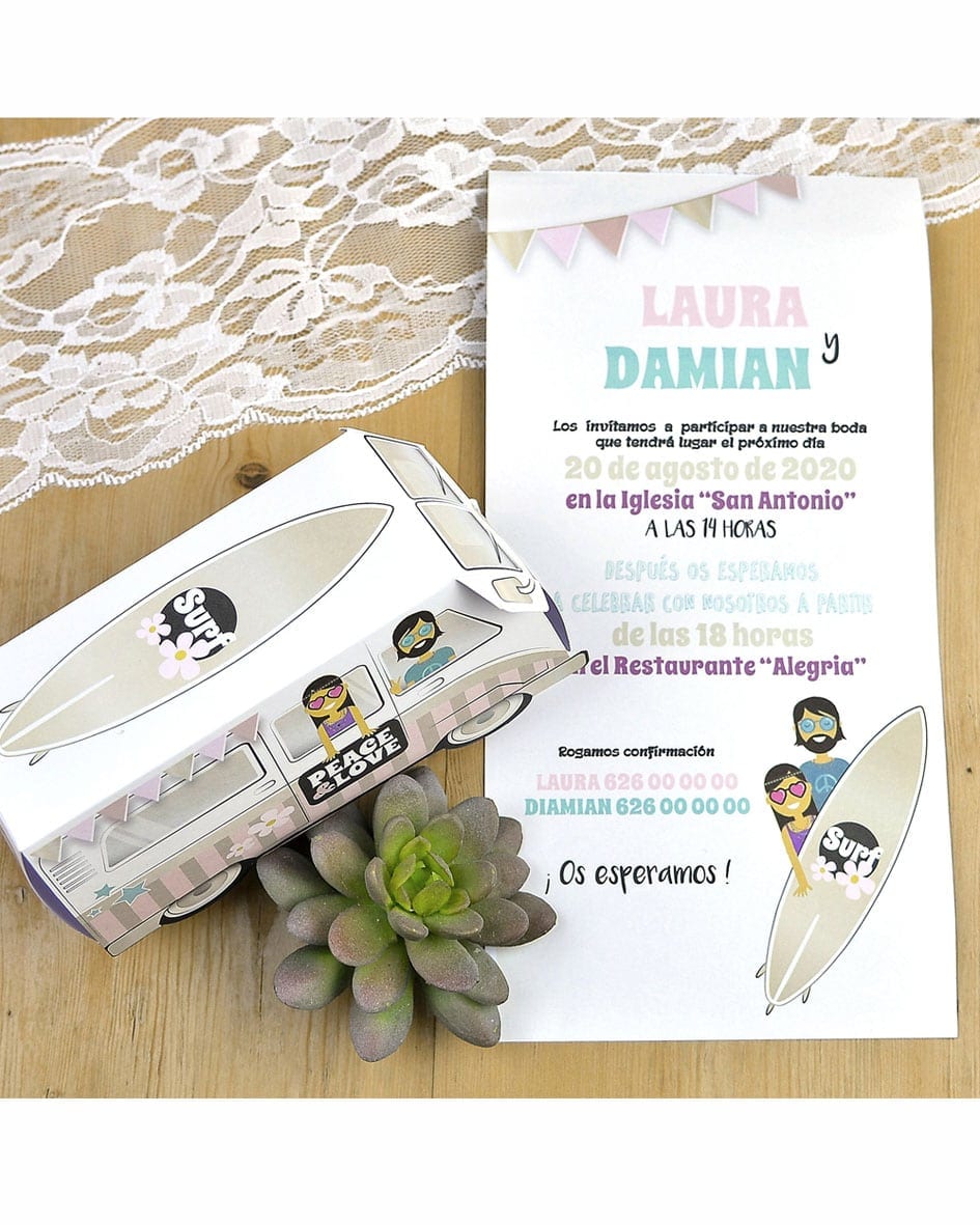 Invitación para bodas original y económicas, todas nuestras invitaciones incluyen el sobre y complementos como se muestran en las imágenes. Con esta invitación de boda sorprenderás a tus invitados. Invitación maleta viaje