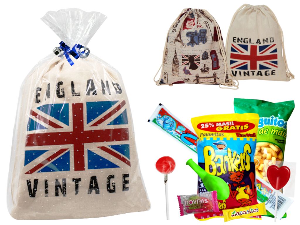 Mochila de tela ciudades con golosinas, Regalo ideal y original para tu evento.