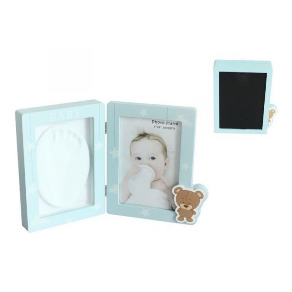 Portafotos doble con espacio para una imagen y por la otra parte contiene una masilla en la cual se puede inmortalizar la huella del bebe.