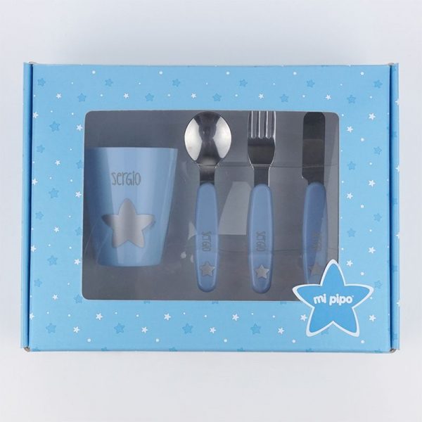 Set vasito y cubiertos acero personalizados azul